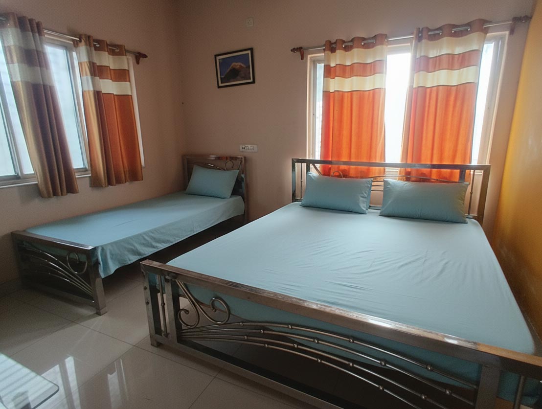 - 03 Adults sharing 01 Triple bed room (with separate washroom) on Ground Floor: Rs. 1150 (Non AC) per head per day.